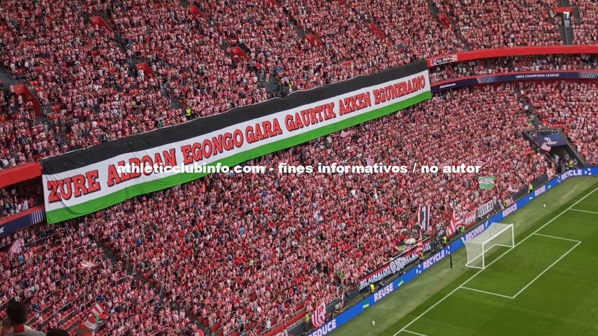 En el fondo norte del estadio, los aficionados desplegaron una enorme pancarta con los colores de la bandera palestina y un mensaje en euskera: “Zure alboan egongo gara gaurtik azken eguneraino” (“Estaremos a tu lado desde hoy hasta el último día”). Esta iniciativa, impulsada por la afición rojiblanca, busca visibilizar la situación en Gaza.