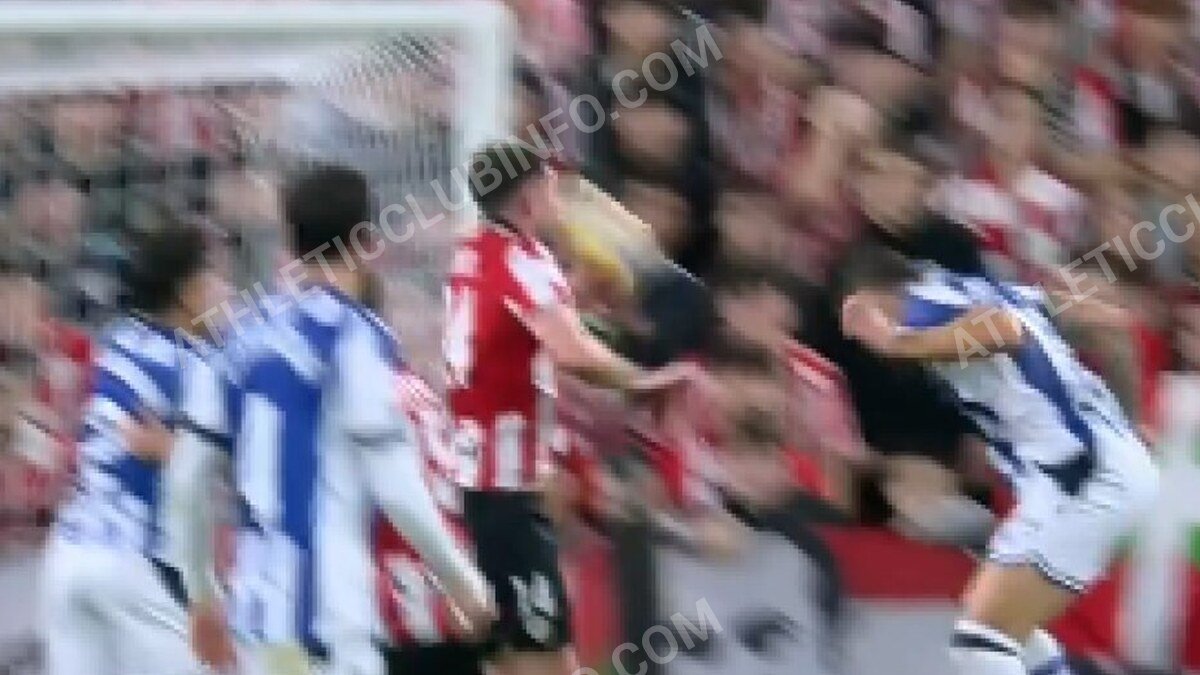 fue casi entonces, antes en el añadido, cuando llegó la jugada que marcó el debate. la acción nació en un córner botado por sergio gómez desde la izquierda. caleta-car se impuso en el área y su remate, potente y con dirección, impactó claramente en el brazo de aymeric laporte. el defensor tenía el brazo despegado del cuerpo, ocupando espacio dentro del área.