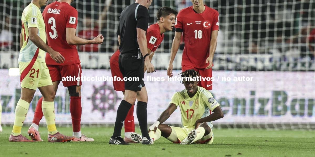 El jugador del Athletic Club, Nico Williams, sufre una “lesión muscular moderada” en la aductora izquierda tras un partido con la selección española en Turquía. Regresó a Bilbao para someterse a pruebas y se espera que esté de baja alrededor de tres semanas, justo antes de los próximos compromisos del equipo.