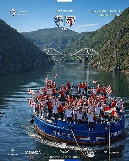 El Ourense ha compartido en sus redes sociales un cartel que muestra una gabarra llena de aficionados rojiblancos, portando camisetas y banderas de Euskadi, navegando por uno de los ríos de la Ribeira Sacra, presumiblemente el Miño.