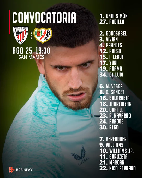 El equipo ha anunciado la convocatoria para el próximo partido contra el Rayo, donde destacan las inclusiones de Sancet, Unai y Prados. Sin embargo, Vencedor e Izeta no formarán parte de la lista de jugadores disponibles.
