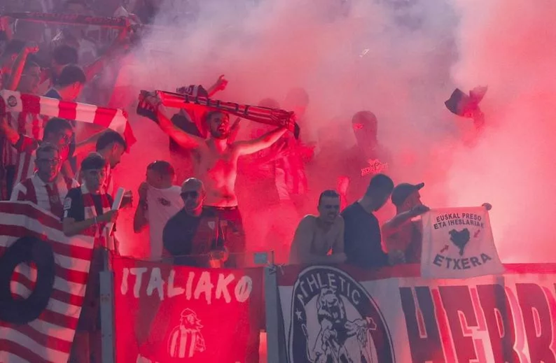 Aficionados del Athletic lanzaron bengalas hacia los seguidores locales durante un partido.