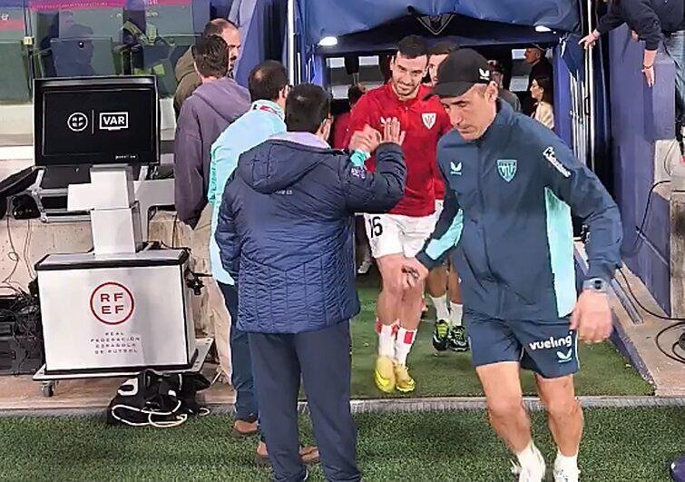 Ambos futbolistas ejercieron de capitanes en el sorteo de campos, junto a los jugadores que portaban el brazalete, Lekue y Elgezabal. La conexión entre Ibarloza y el equipo del Athletic se hizo evidente cuando fue invitado a participar en el ‘corro’ de ánimo previo al partido.